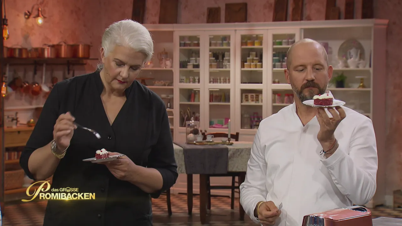 In der ersten Aufgabe der finalen Folge sollen sich die prominenten Hobbybäcker Red Velvet widmen. Dafür müssen sie rote Böden und weiße Creme kombinieren. Nachdem die Zeit abgelaufen ist und Jochen Schropp ordentlich zu kämpfen hatte, ist Kai zufrieden mit seinem Werk. Doch sieht die Jury es auch so?