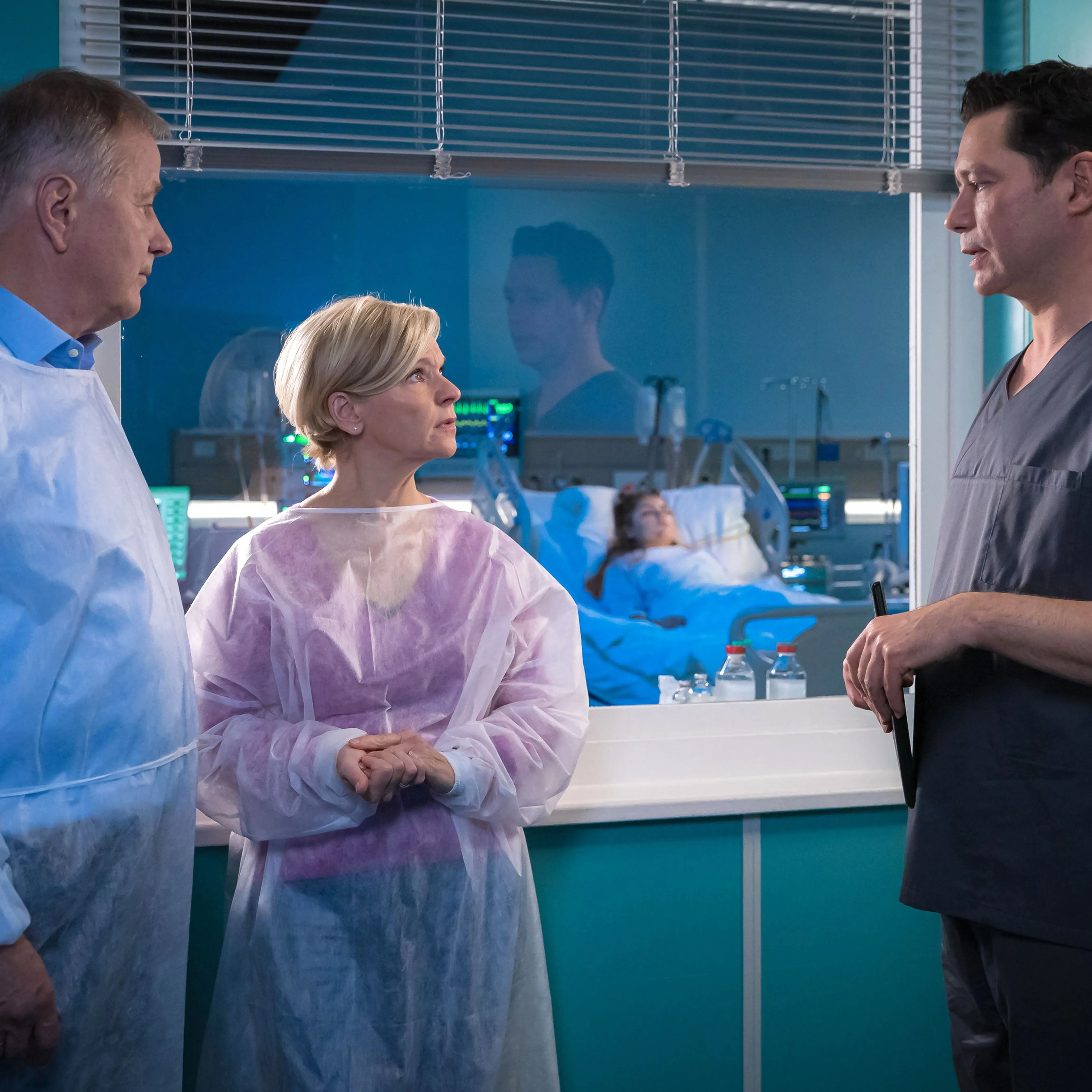 Kris Haas (Jascha Rust) und auch andere Mitarbeiter:innen haben sich inzwischen an Pflegeroboter Berta als verlässliche Unterstützung im Klinikalltag gewöhnt. Sie ist mittlerweile mehr als eine technische Hilfe. Mit ihrer charmant-schroffen Art, kleinen Eigenheiten und unerwarteten, aber oft passenden Kommentaren, hat sie sich längst in den Stationsalltag integriert.