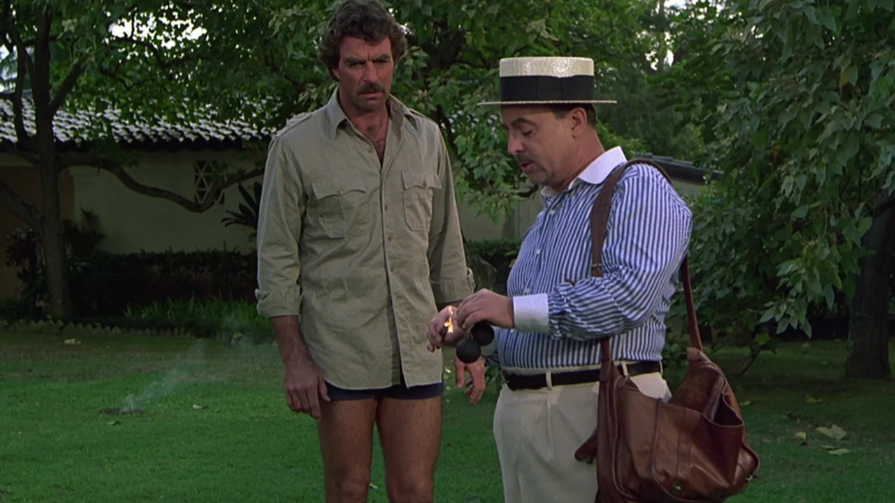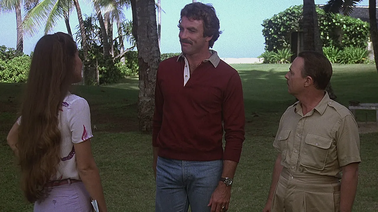 Womit wir auch direkt beim größten Pluspunkt der Serie wären. Wenn "Magnum" heute noch funktioniert, dann vor allem wegen seiner Figuren. Tom Selleck als Thomas Magnum trägt die Serie mühelos. Er ist kein klassischer harter Detektiv, sondern eher eine Mischung aus Abenteurer und Gelegenheits-Philosoph. Das merkt man vor allem an der Dynamik zwischen ihm und Higgins, dem Verwalter des Anwesens, auf dem Magnum lebt. Die Mischung aus gegenseitiger Stichelei, Respekt und gelegentlicher Genervtheit funktioniert noch immer gut. Nicht umsonst ist das Motiv eines vollkommen gegensätzlich gezeichneten Duos (zum Beispiel zwischen Ermittler:innen) eines der beliebtesten in Krimis und Thrillern. Und so leben viele Szenen gar nicht von der Crime-Handlung, sondern einfach davon, wie die Charaktere miteinander umgehen.