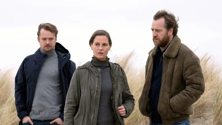 von teleschauIn den Dünen Ostfrieslands: Hier entstand "Ostfriesentotenstille" um Hauptkommissarin Ann Kathrin Klaasen, ihren Mann und Kollegen Frank Weller (rechts) und den Tatverdächtigen Dr. Bernhard Sommerfeldt.