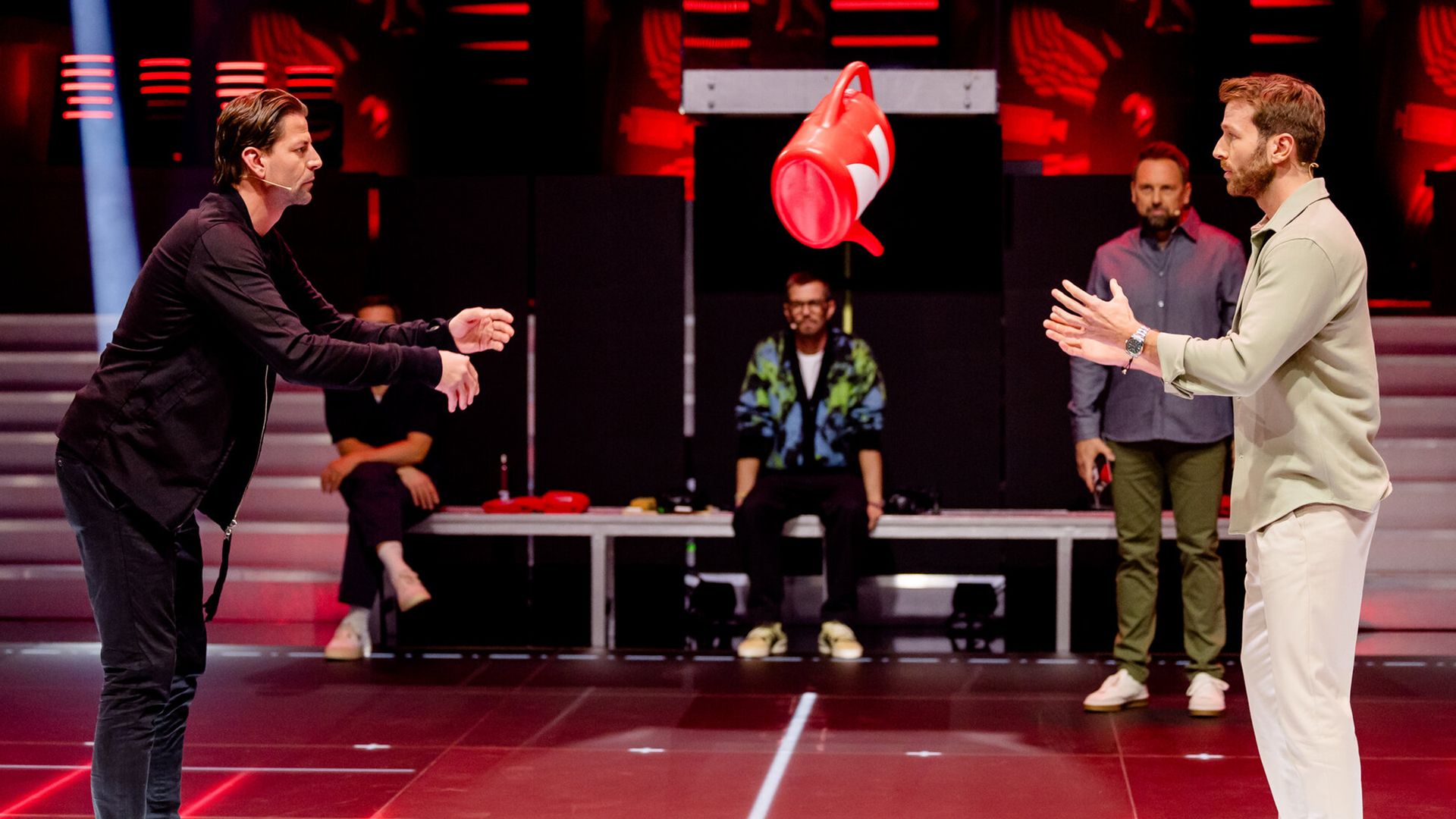 Werfen und Fangen ist ja ohnehin schon schwer. Wenn es dann aber auch noch mit unhandlichen Objekten und gegen einen Weltmeister-Torwart und einen überdurchschnittlich sportlichen Moderator gespielt wird, stehen die Chancen auf Erfolg richtig beschissen.