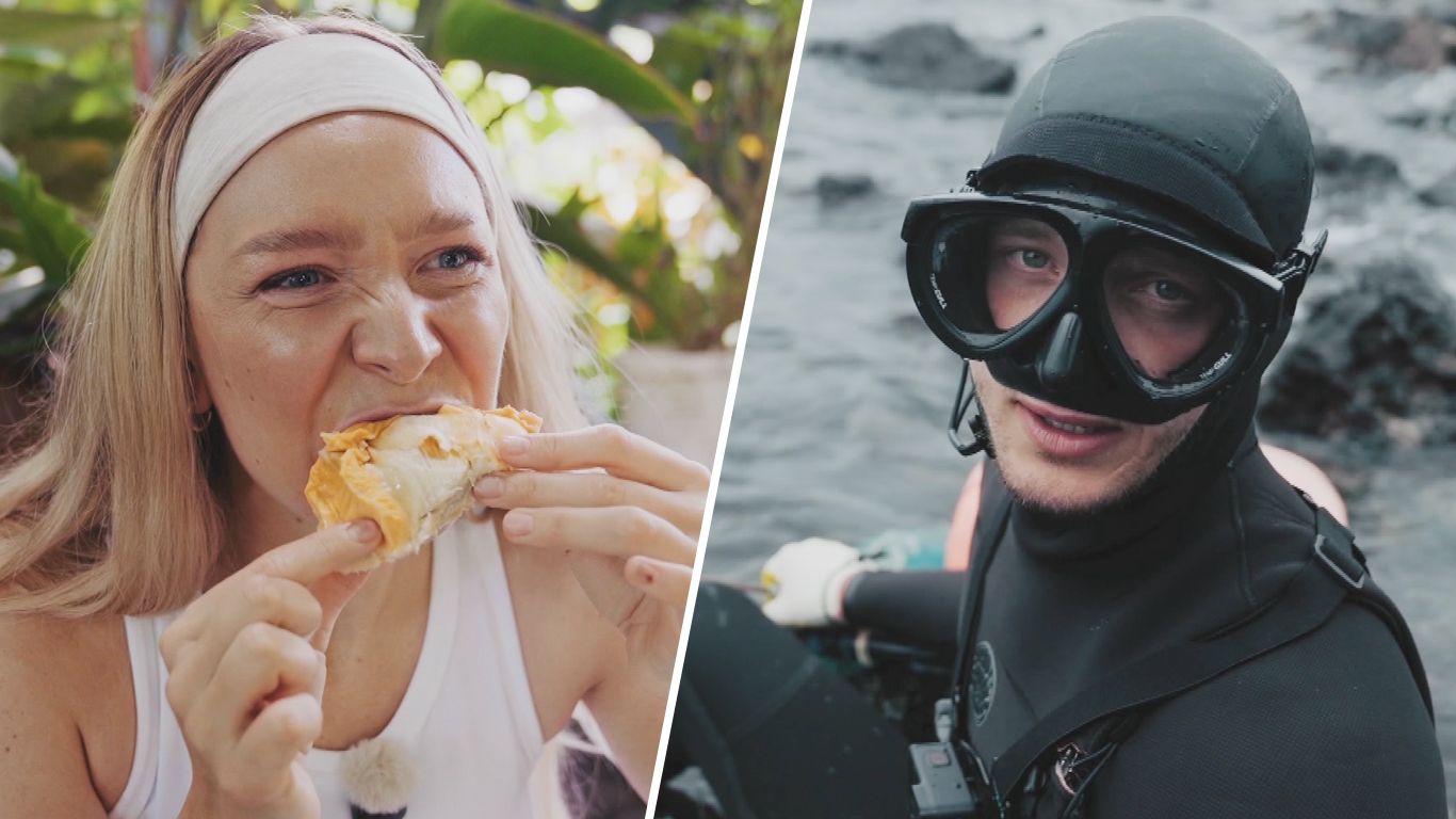 Kim Caramella reist auf die Philippinen zur berüchtigten Durian - eine Frucht, die wegen ihres extremen Geruchs vielerorts verboten ist. Moritz Hans kämpft sich in Südkorea an die Seite der legendären Haenyeo, den Apnoe-Taucherinnen von Jeju.