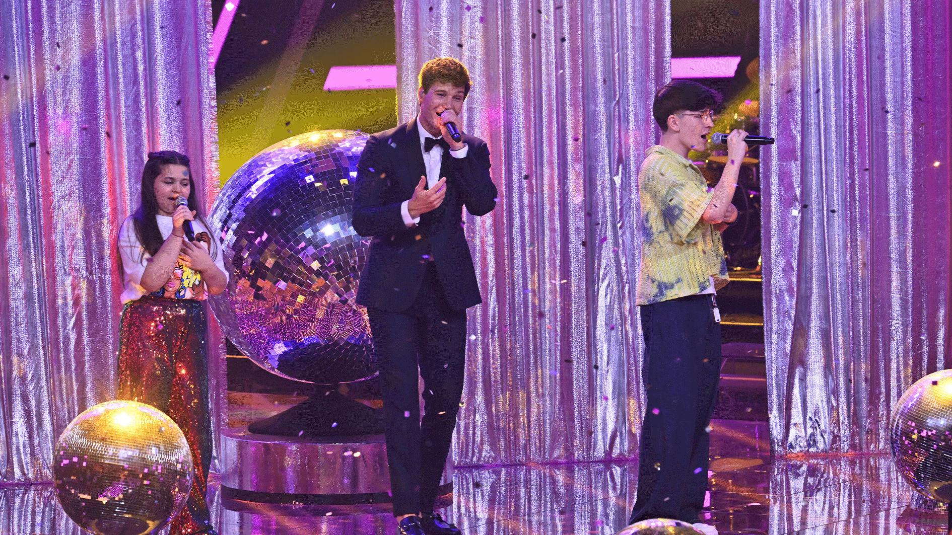 Ab 6Reality-SpielshowMusikNicht nur die Discokugeln auf der Bühne sind eine runde Sache! Am Anfang noch anrührend, entwickelt sich die Performance von Wincent, Jakob und Erika zu einer echten Party. Mit dem Klassiker “Mamma Mia” von ABBA singen sie sich in die Herzen des Publikums!