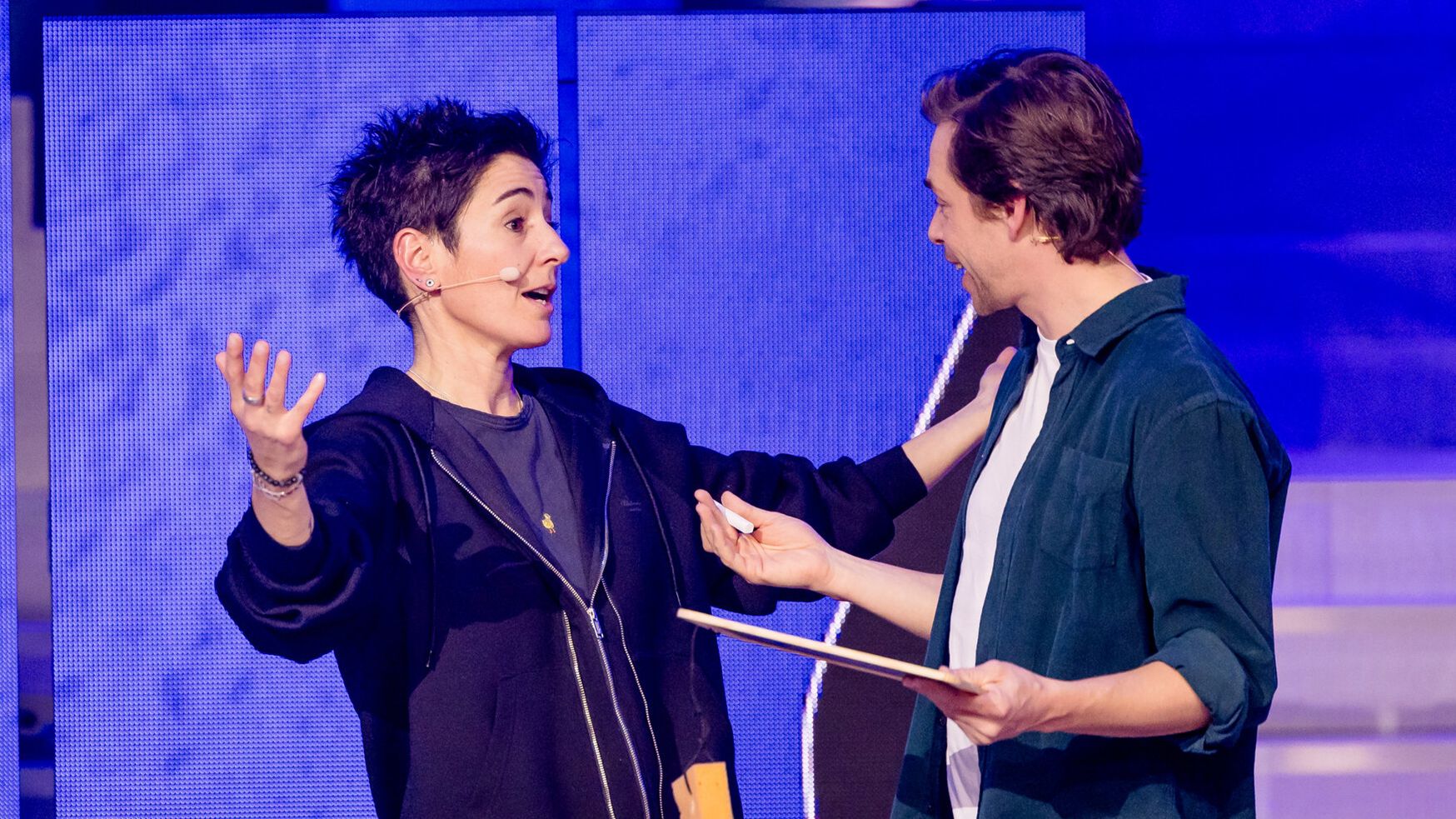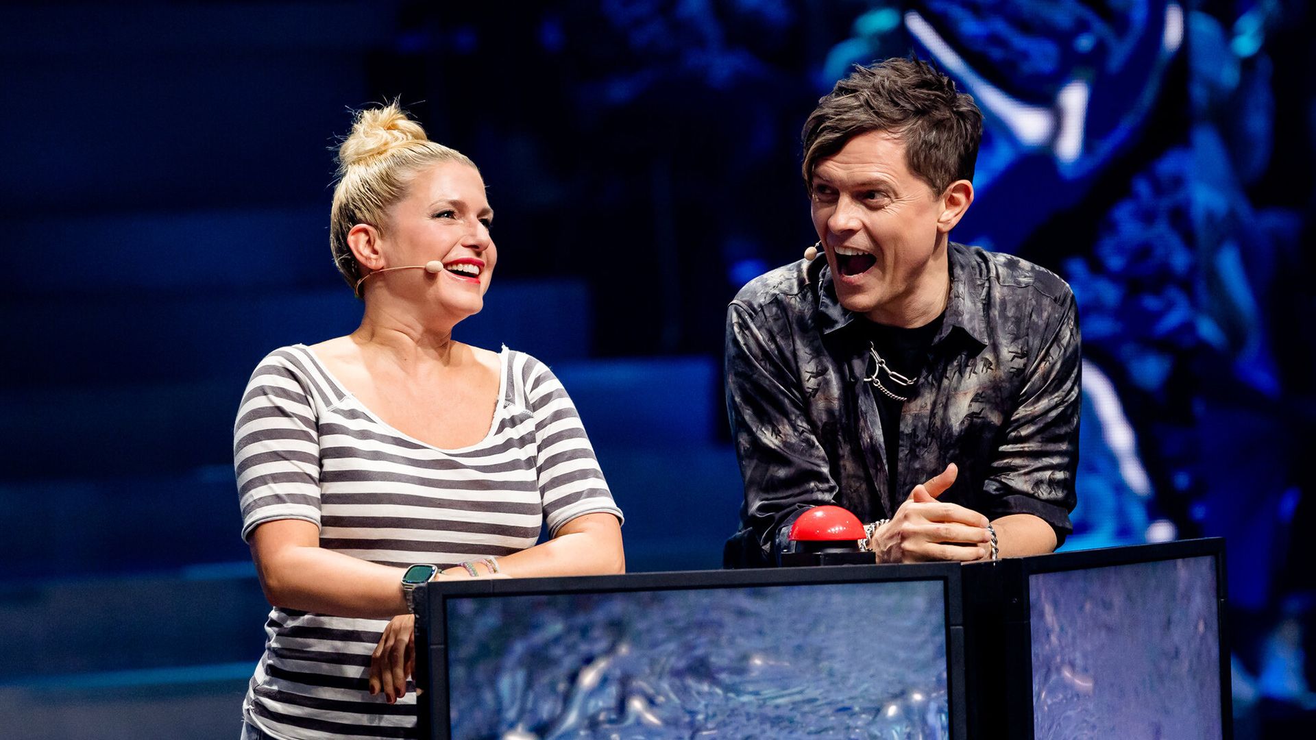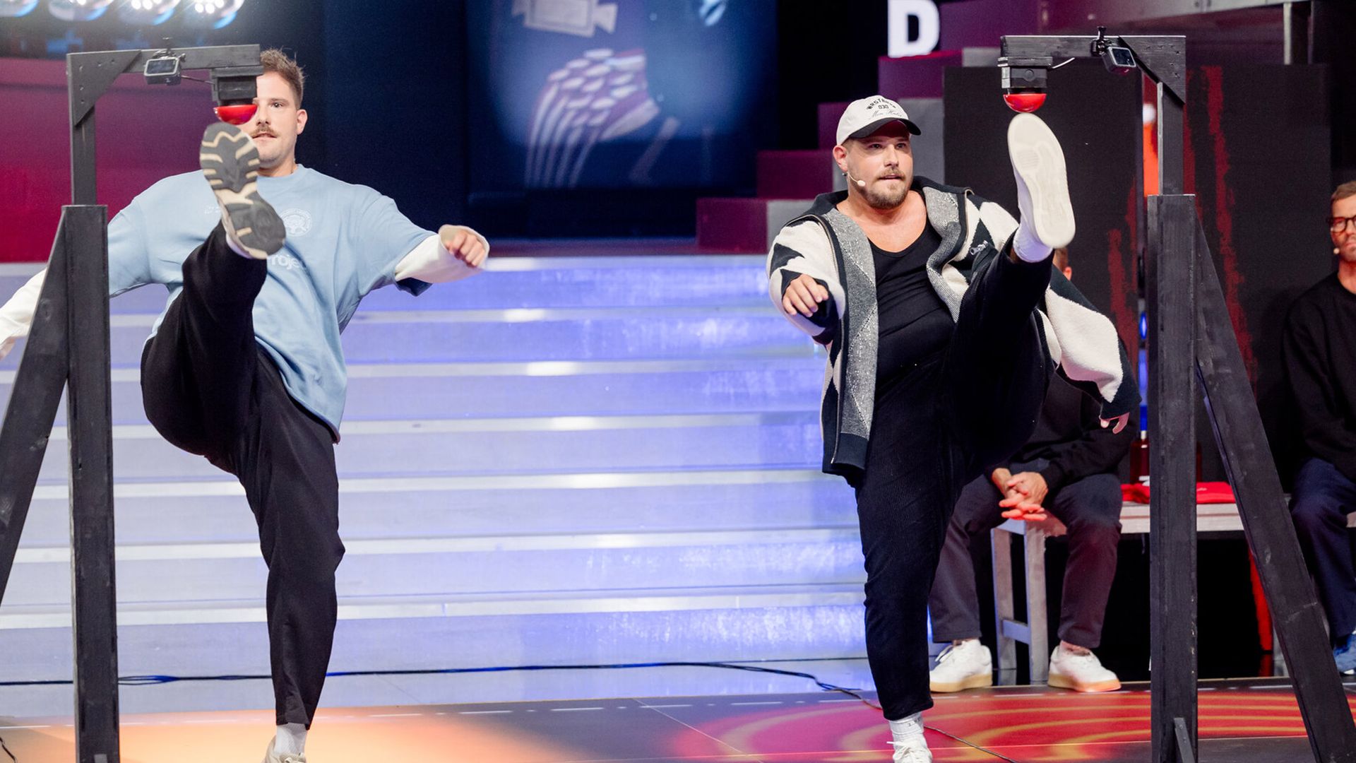 Mutig, aber für Joko & Klaas unumgänglich, in diesem Spiel gegen die Wolter-Zwillinge in ihrer Kernkompetenz anzutreten: Songs erraten. Vielleicht sind sie weniger talentiert darin, jeweils einen ca. 2 Meter hoch hängenden Buzzer im gleichen Takt zu treten