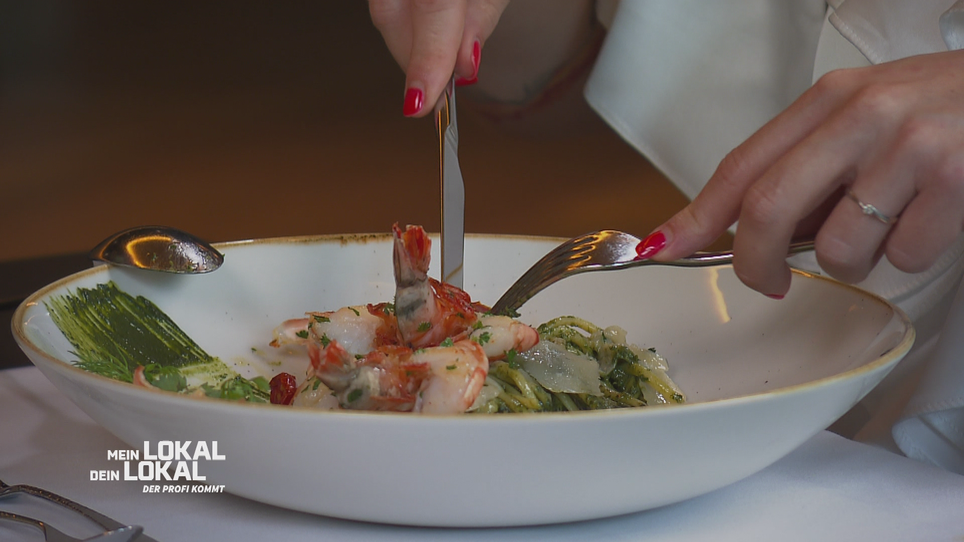 Ab 12KochenRealityProfikoch Robin Pietsch bekommt im Lokal "Emser Thermenhotel" Linguine mit Garnelen serviert - er hatte eigentlich mehr von Chef Wolfgang erwartet. Kann der Chef mit seinem Gericht trotzdem den Profi überzeugen?