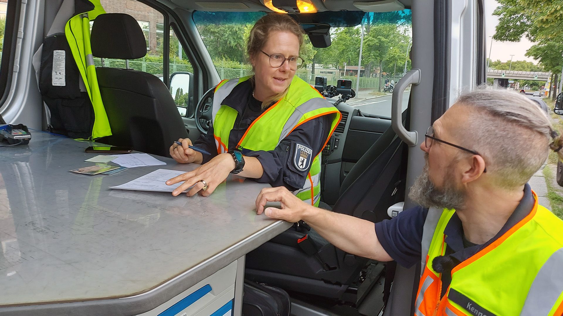 Birgit und Thomas von der Polizei Berlin sorgen für die Sicherheit im Verkehr. Diesmal überprüfen sie, ob die Ladung auf dem Anhänger nicht zu schwer ist. Zudem finden sie noch einen eingefahrenen Nagel im Reifen. Der Anhänger muss stillgelegt werden.