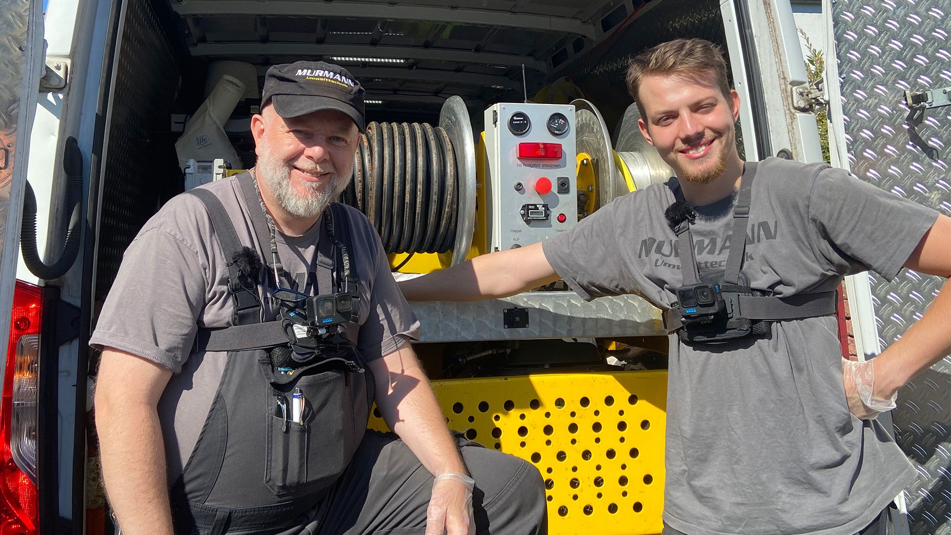 Die Umwelttechniker Ben und Uwe Murmann stellen sich einem Kanalanschluss mit hartnäckigem Dreck und möglichem Wurzeleinwuchs. Das Vater-Sohn-Gespann reinigt mit Hochdruck und Rückstrahldüse und auch einer Prise Humor den "Klumbatsch", wie Uwe sagt.