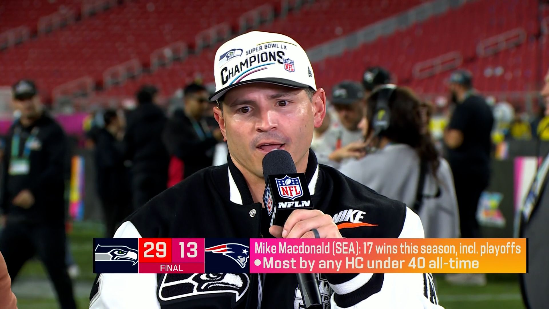 SportSeahawks-Coach Mike Mcdonald spricht über den gewonnen Super Bowl gegen die New England Patriots.