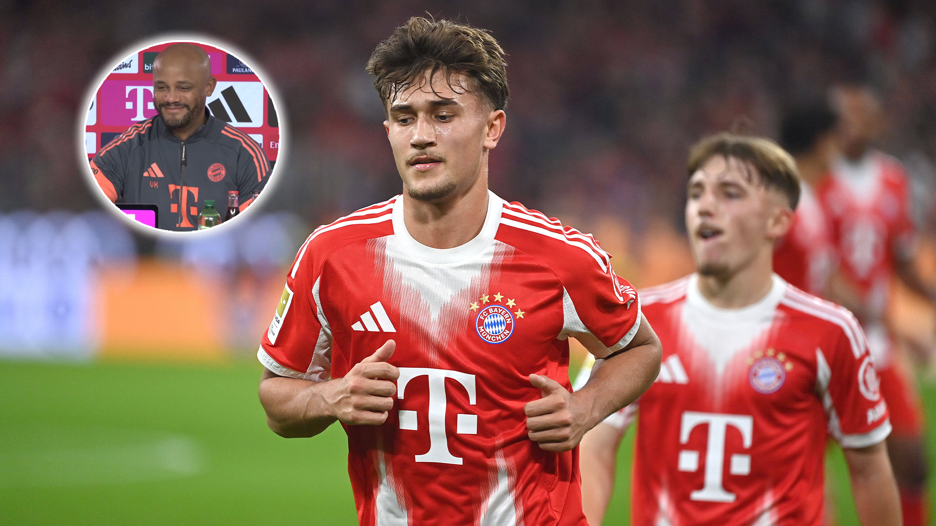 SportLennart Karl und Tom Bischof kommen nach starken Leistungen bei der U21-Nationalmannschaft zum FC Bayern München zurück. Bei dieser Frage muss Trainer Vincent Kompany lachen.