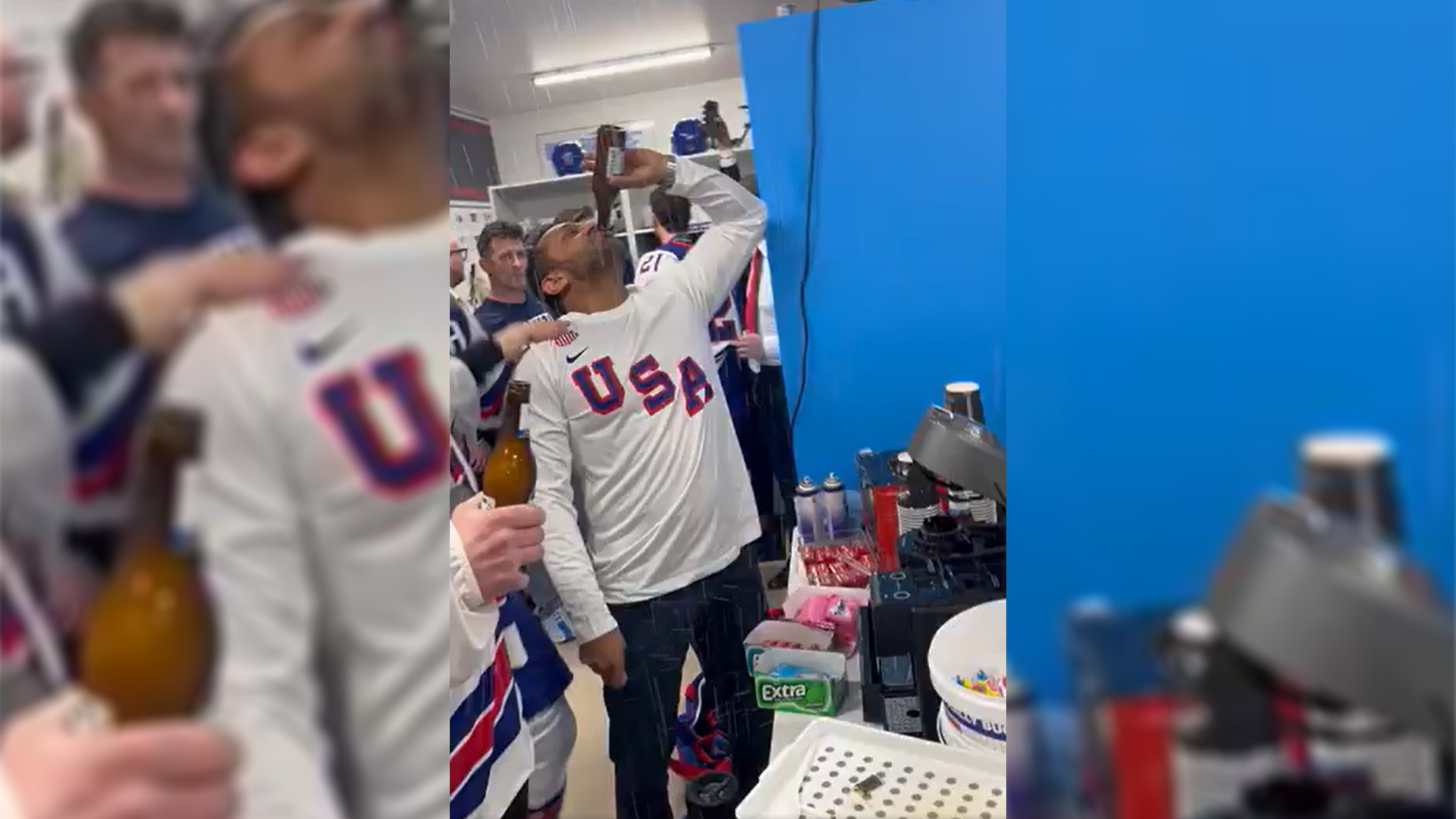 SportDer FBI-Direktor Kash Patel feiert nach dem 2:1 Sieg der USA gegen Kontrahent Kanada ausgelassen im Trikot und mit Bier zusammen mit dem Team in der Kabine.