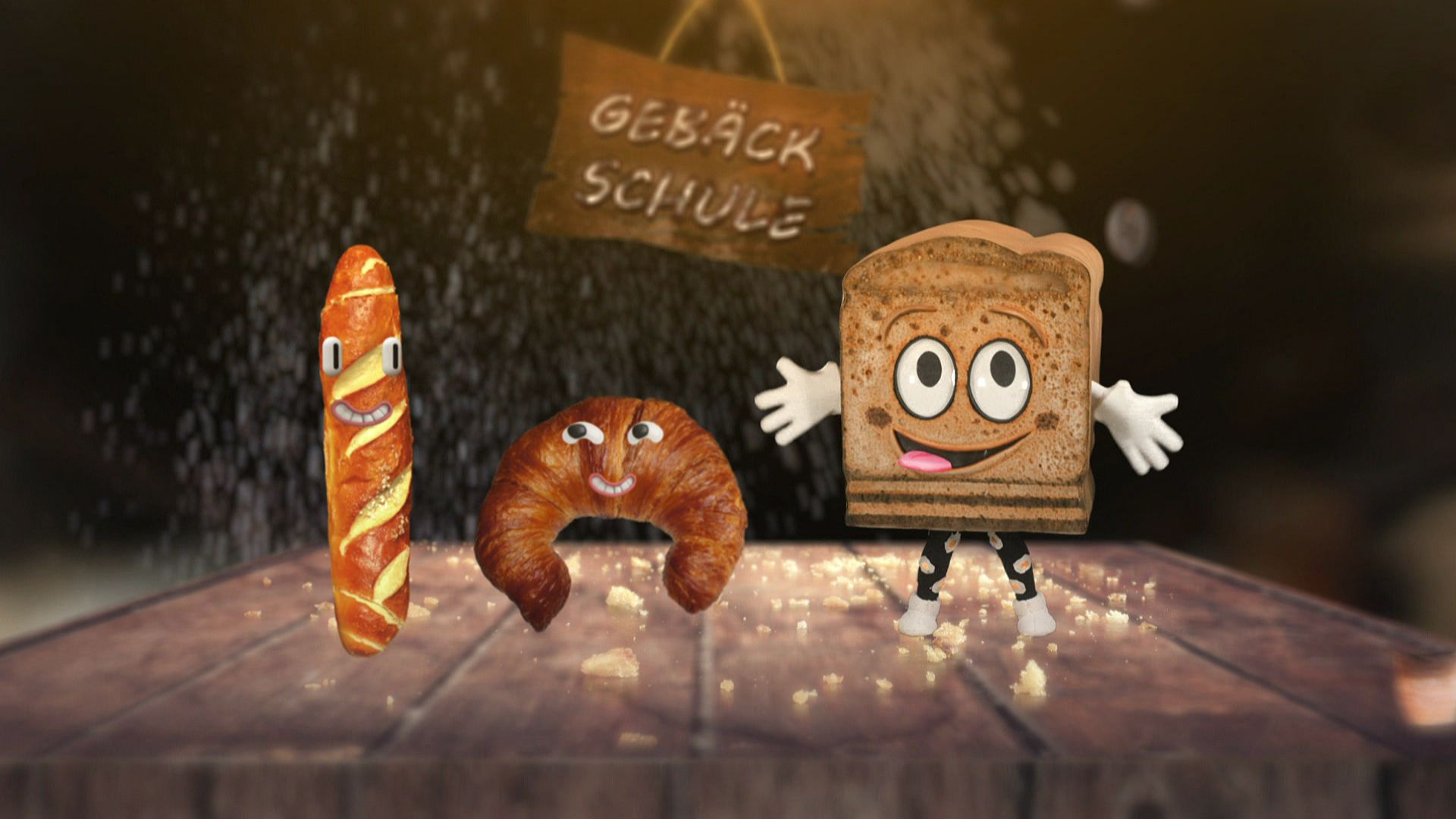 Der Toast trifft sich mit seinen alten Schulfreunden in der Gebäckschule. Seine Kumpels das Baguette und das Croissant sind auch schon da, um gemeinsam eine Runde Krümelball zu spielen. Wer könnte sich unter der Maske verstecken?